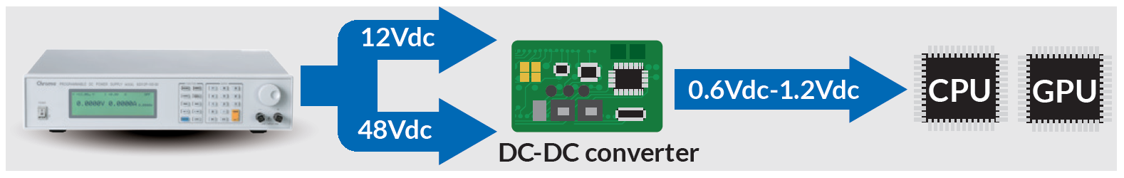 以CPU及GPU供电顺序来看,多数是由12V或是48V经过DC-DC转换器,降为0.6V至1.2V给CPU及GPU的电源使用,在DC-DC转换器前端可以参考Chroma 62000P系列,具有40V/120A/1,200W及80V/60A/2,400W输出能力适合选用,其DC-DC模块输出电压范围约在0.6V至1.2V,63202 -20具有20V、1,000A或2,000A、2,000W带载能力,特别适合低压大电流等相关测试。