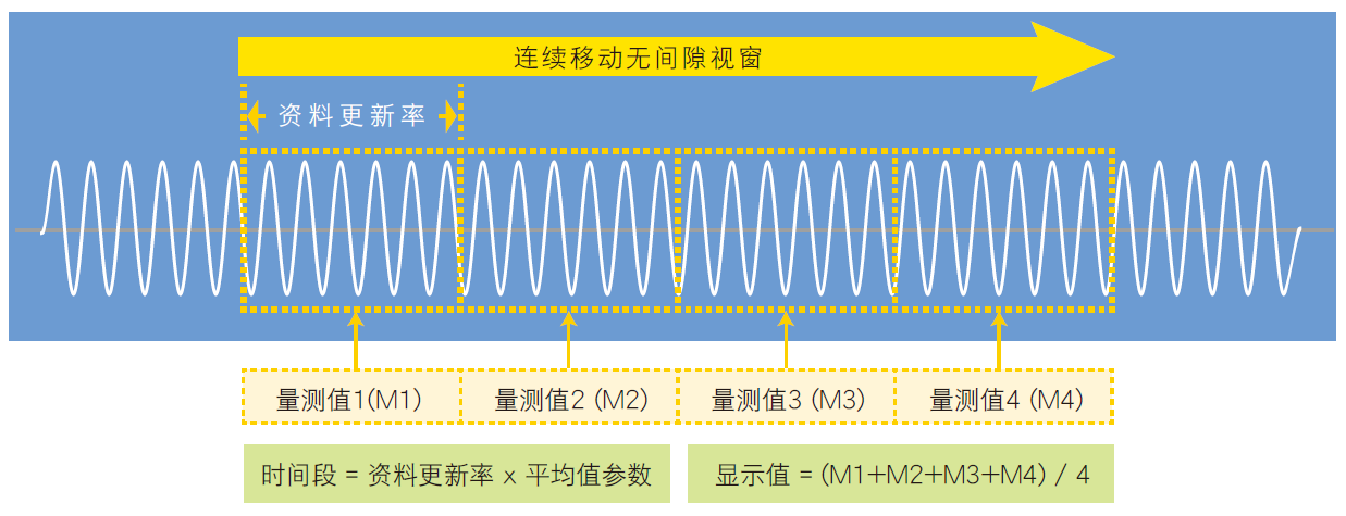 参数测量方式:在一时间段内将连续移动无间隙视窗所有量测到的值量平均。请注意,时间段(Time frame)的时间设置等同于Data Update Rate(资料更新率) x AVG(平均值参数)。