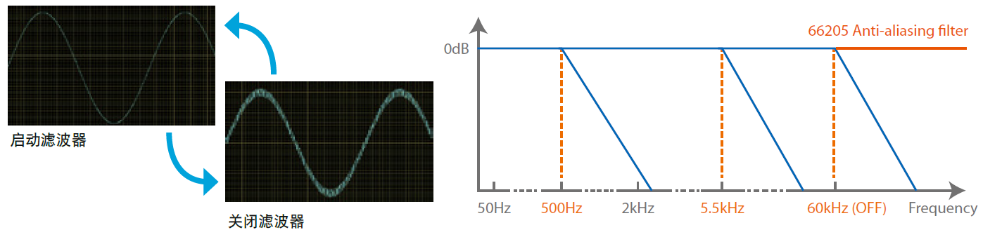 Line Filter是具有高衰减率(≥70dB)的数位低通滤波器。当Line Filter设定启动时,测量值不会包含高频分量,例如: 切换式电源的高频噪音部分。 66205提供三组Line Filter,截止频率为OFF,500 Hz和5.5 kHz。 5.5kHz的Line Filter规格符合IEC 61000-3-2国际标准之设备要求,建议谐波量测时将滤波器开启。