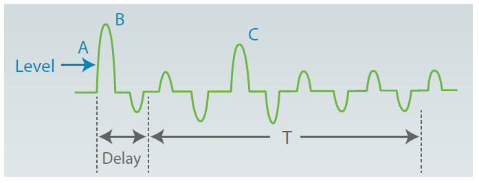 66205功率表提供量测浪涌电流(Is)的功能,使用者可以设定一个电流准位(A)来触发开始量测电流,或使用后背板的TTL信号来进行触发;另外可设定延迟参数( Delay),用来延迟真正撷取电流波形的时间,可帮助忽略掉刚开始不需要的波峰B;时间参数T,为实际撷取波形的时间长度。透过以上设定机制,66205数位功率表可量测到C点的波峰电流,在实际应用上可以避开待测物输入端X电容造成的效应,可侦测到有缓开机(Soft-start)的真正浪涌电流。