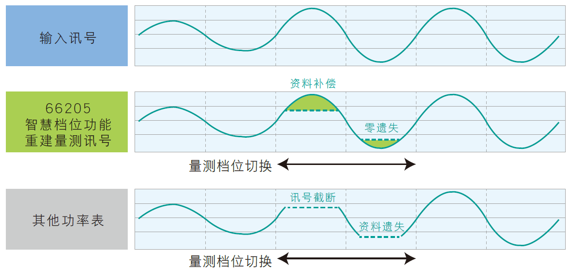 智慧档位(Smart Range)功能允许功率积分模式(Power Integration)可在自动档位条件下进行功率量测,量测动态或不稳定的电压与电流讯号,即使档位随着讯号变化而切换,也不会让量测资料遗失,真正做到无间隙的波形采样与量测。