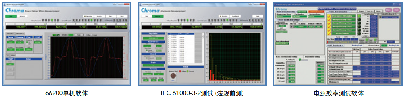 66200系列功率表提供单机软体,让使用者透过USB、GPIB或LAN介面在电脑上控制及读取资料,还可观察电压电流波形、记录随时间变化的关系图,及设定参数及时间,将长时间量测值储存至档案后供分析。此软体也支援IEC 61000-3-2谐波电流限制测试之法规前测 (Pre-Compliance),允许使用者确认UUT是否符合谐波电流限制值要求。另外电源效率测试软件,整合66205功率表、电子负载及交流电源,可依照节能规范简单设定后,即可自动按法规步骤进行测试,并产生报告,相当适用于研发或品保验证。