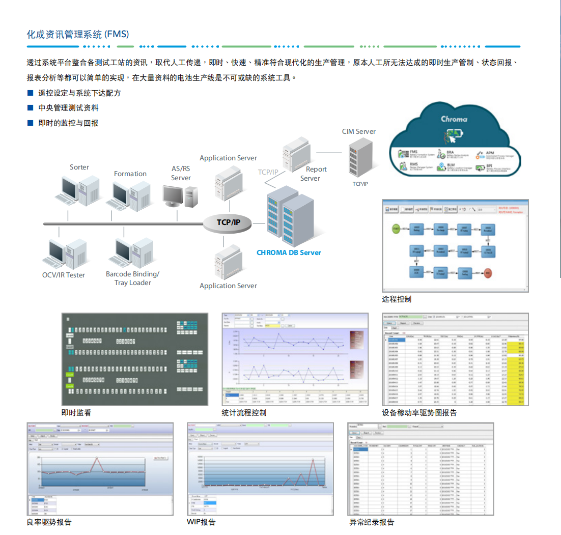 电池化成整体解决方案是Chroma针对电池芯生产线提供的整体规划服务,由活化到分级配对依据制程工艺做最适当的设备或系统性规划,包含仪器设备建构、物流规划、生产管理系统等,提供多样客制功能,量身打造高效益产线。