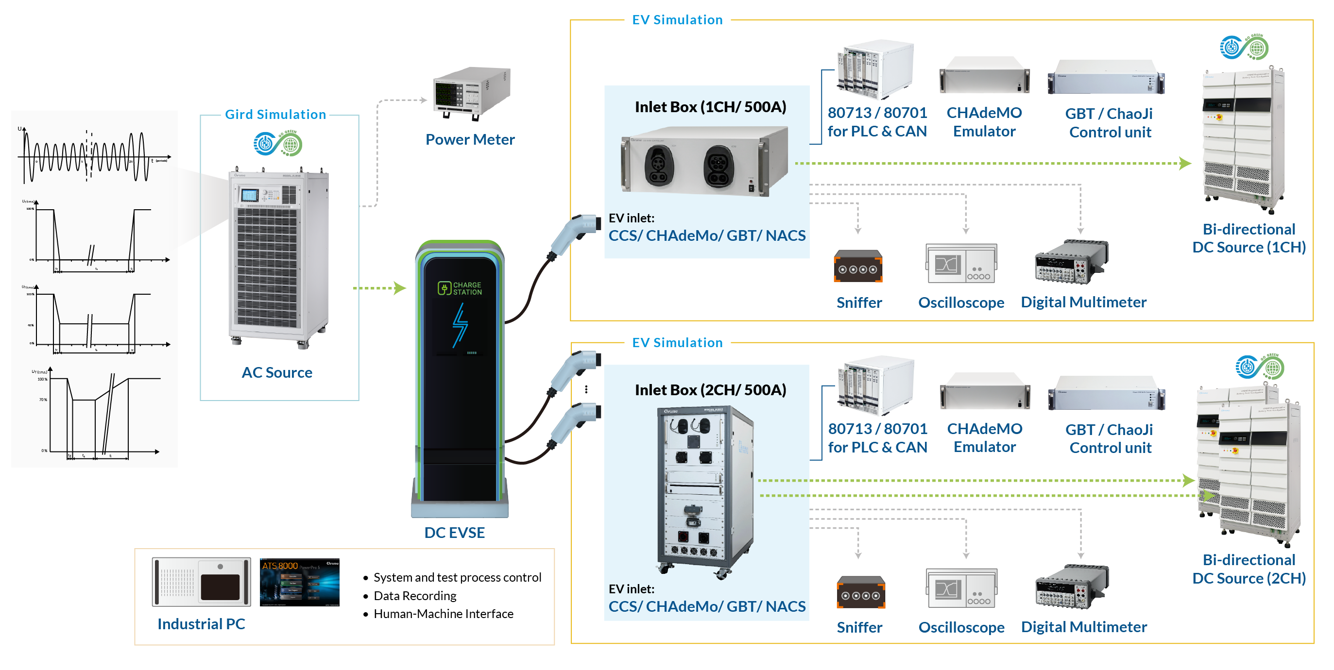 Chroma提供用户国际化的测试系统,利用Chroma 8000 ATS,实现全球各大标准测试,包含:SAE、CNS、NB/T、GB/T、IEC、ISO、DIN、CHAdeMO、NACS、ChaoJi、MCS等,协助用户将产品推向国际舞台。