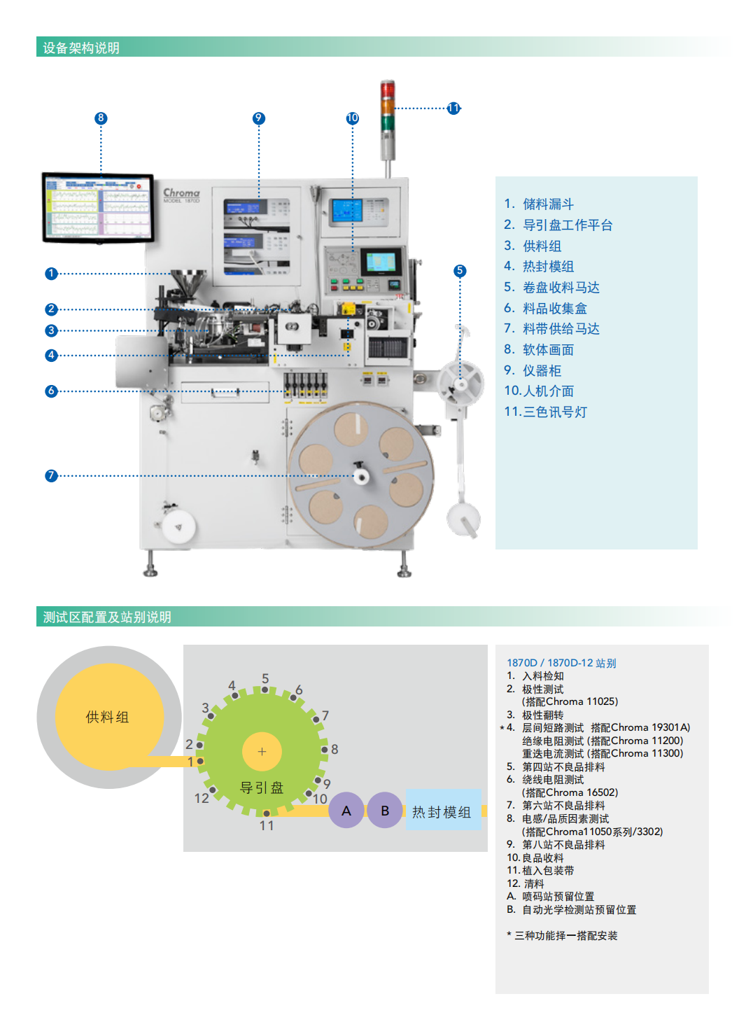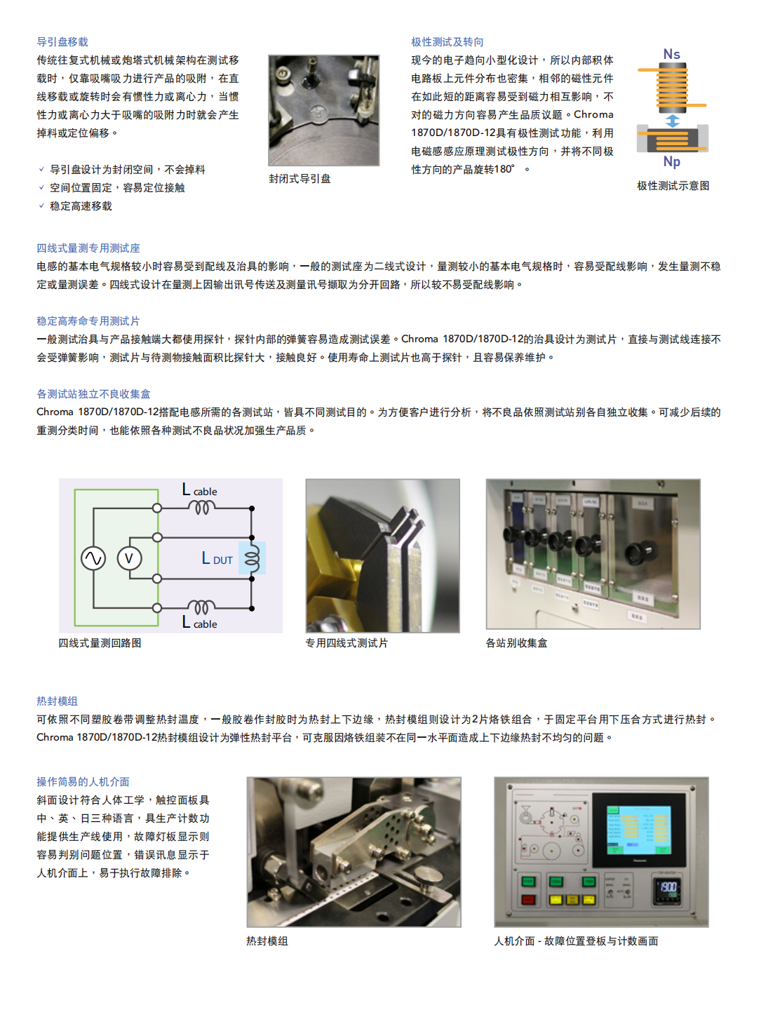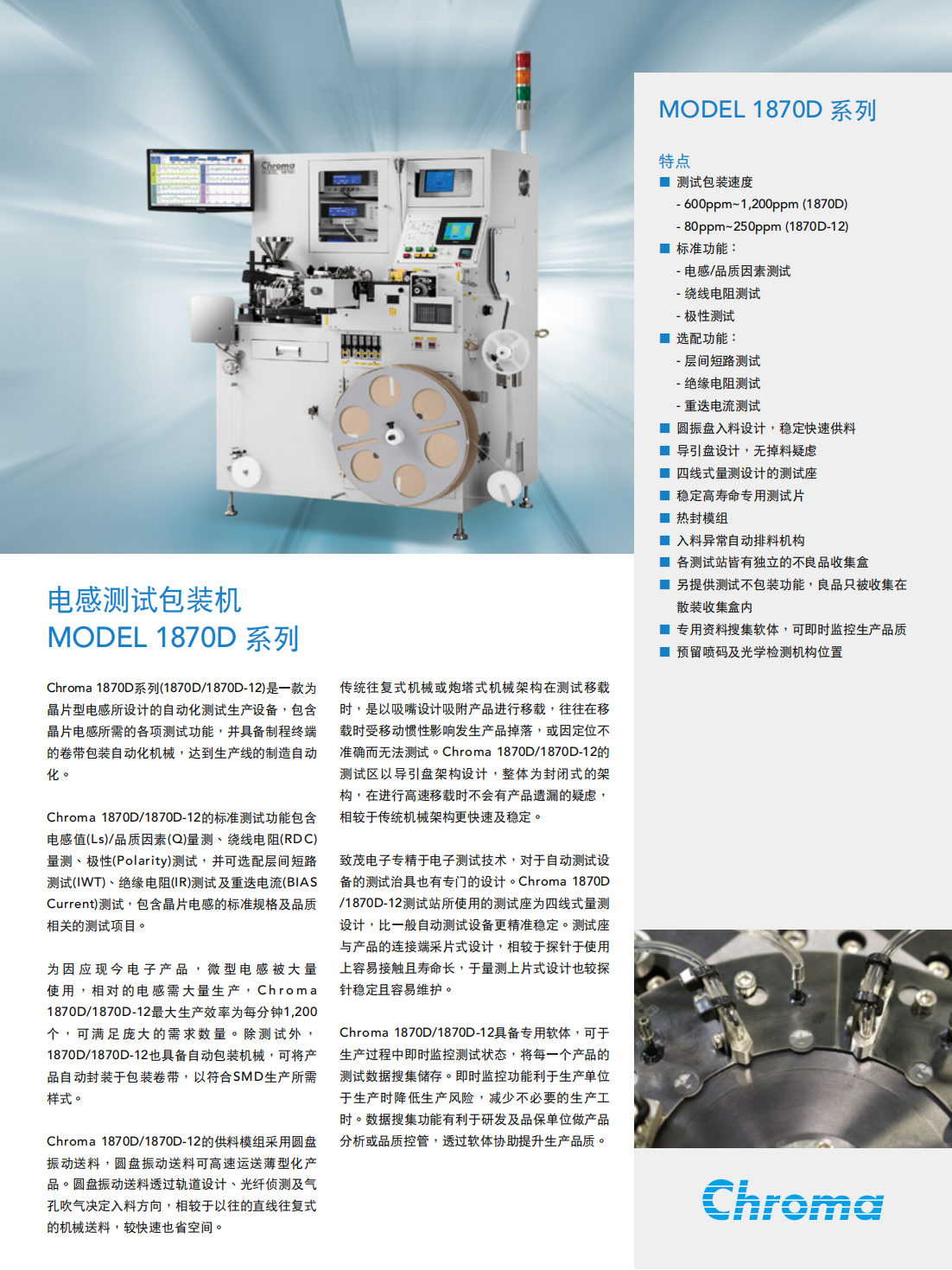Chroma 1870D系列(1870D/1870D-12)是一款为晶片型电感所设计的自动化测试生产设备,包含晶片电感所需的各项测试功能,并具备制程终端的卷带包装自动化机械,达到生产线的制造自动化。