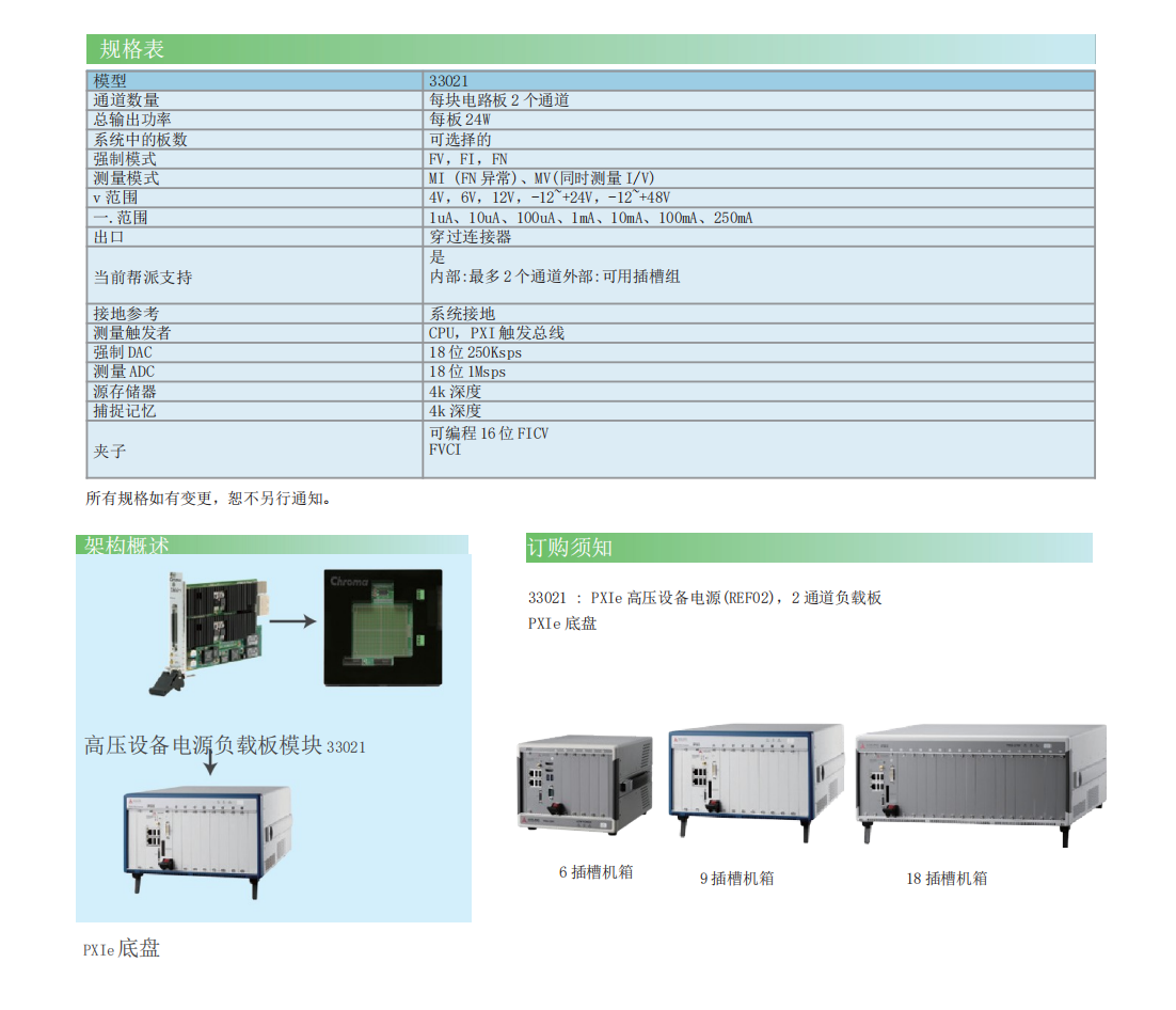 基于 Chroma 33021 PXIe 的可编程电源卡是一个集成电源模块,可在 250mA 电流下提供高达48V 的电压。输出可以组合在一起,每个卡的输出电流高达 500mA,并且可以跨卡并联,以 满足高电流需求。