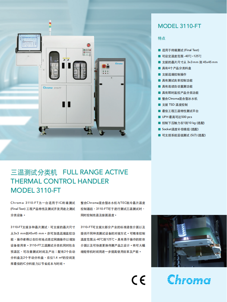 Chroma 3110-FT为一台适用于IC终端测试(Final Test)工程产品特性及测试开发用途之测试分类设备。